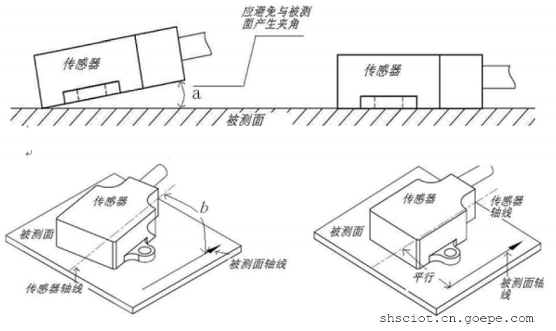 两线指传感器轴线与被测面轴线平行,两轴线不能有夹角产生(如C图中的角b),正确的安装方式如D图。